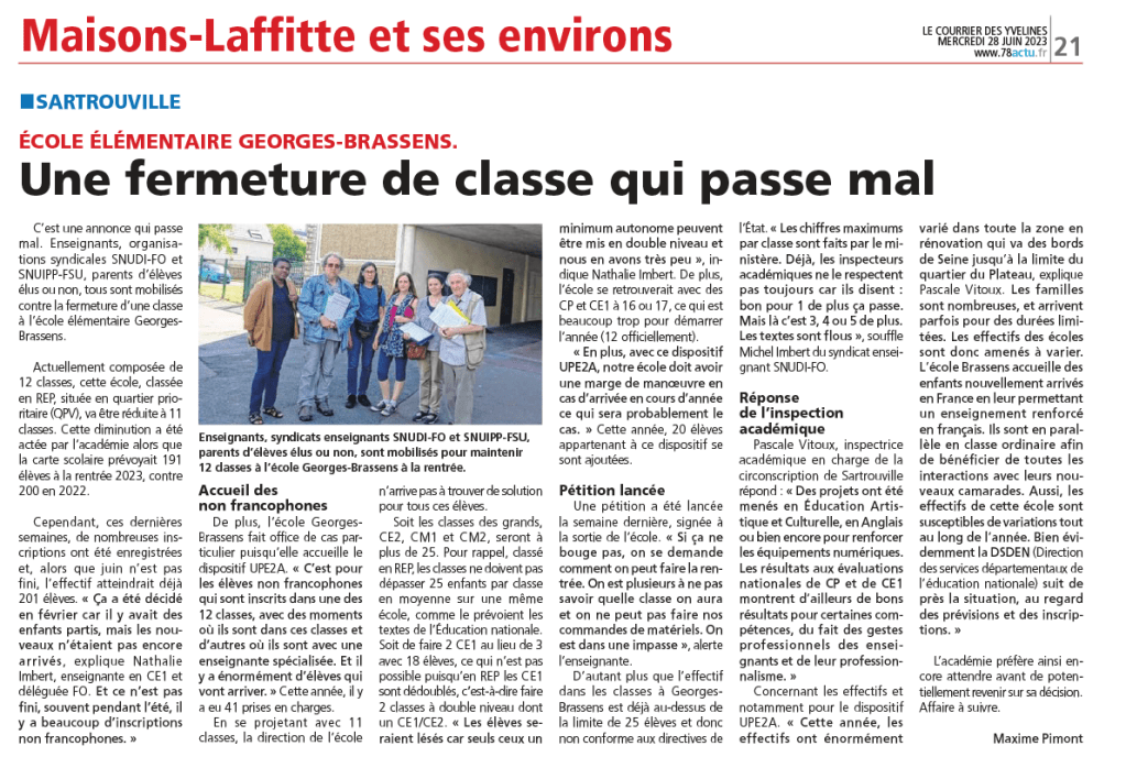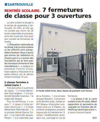 Lors du dernier conseil municipal de Sartrouville, nous avons interrogé le Maire sur les perspectives de rentrée et avons obtenu plusieurs précisions que la presse (merci @78actu) reprend ici, soit 3 créations de classes mais 7 fermetures dont 1 pour l’école élémentaire Georges Brassens pourtant en REP et aux effectifs nombreux dont des enfants nouvellement arrivés en France. Des changement peuvent encore survenir jusque fin août en fonction des informations collectées par le rectorat, à suivre avec la plus grande vigilance.