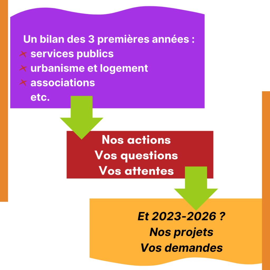 Nous avons échangé depuis le début de ce mandat municipal, avons été en contact, vous nous suivez, vous nous lisez, vous avez des questions etc. C’est la raison pour laquelle nous vous proposons de participer à la réunion de mi-mandat que nous organisons le 21 novembre, à 19h00, salle du 14 juillet.