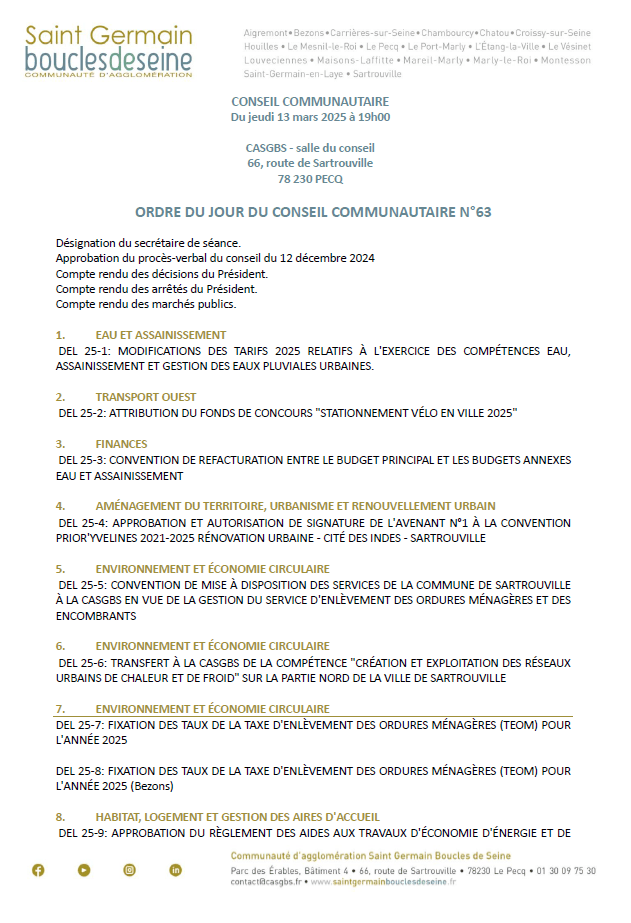 Le prochain conseil communautaire se tiendra le jeudi 13 mars à 19h00 , dans les locaux de la CASGBS au Pecq (Parc des Erables – 66 route de Sartrouville – Bât 4, 3ème étage – porte de gauche).