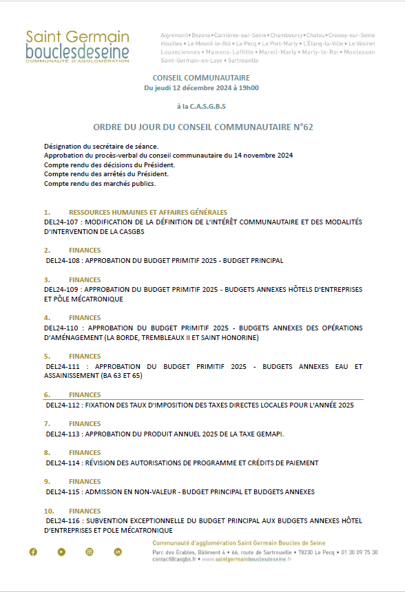 Le prochain conseil communautaire se tiendra le jeudi 12 décembre 2024 à 19h00 , dans les locaux de la CASGBS au Pecq (Parc des Erables – 66 route de Sartrouville – Bât 4, 3ème étage – porte de gauche).